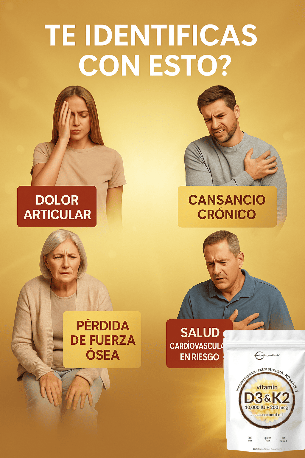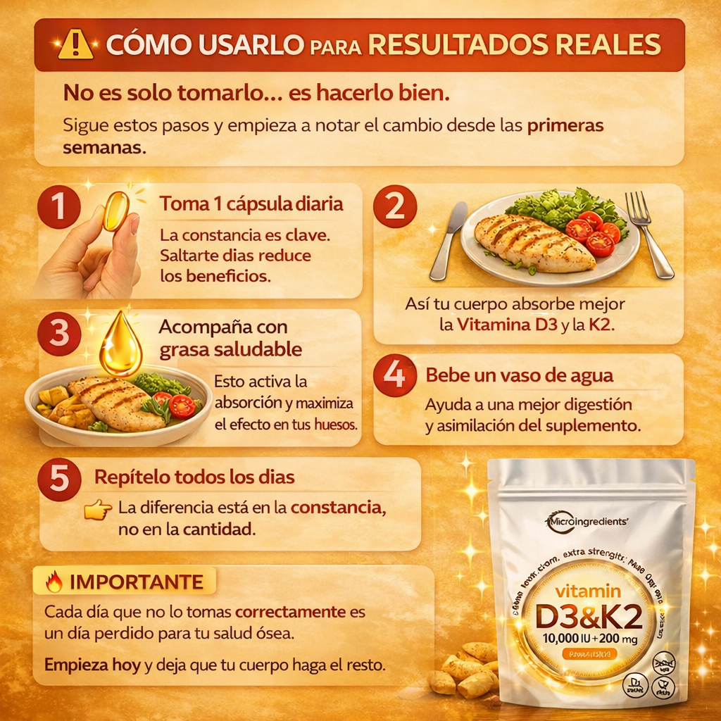 Porque no se trata solo de Vitamina D. La combinación D3 + K2 (MK-7) asegura que el calcio se utilice correctamente, marcando una diferencia real frente a fórmulas incompletas.